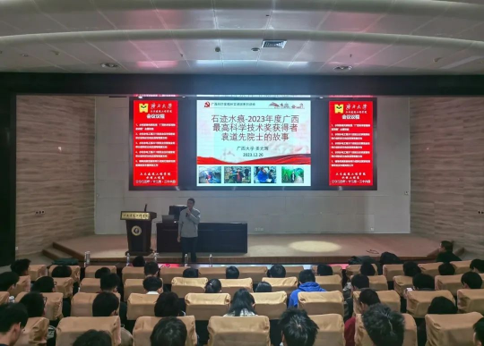在21世纪的科技前沿,科学家们以他们卓越的智慧和坚定的信念,引领着人类对未知世界的探索。他们用卓越的科研成果,推动着科技的进步,为人类社会的繁荣发展贡献着力量。2023年12月26日,我院姜光辉教授以“石迹水痕-2023年度广西最高科学技术奖获得者袁道先院士的故事”为题的科学家精神宣讲活动在学院大型结构试验平台第六报告厅举行,旨在深入探讨科学家精神的内涵和价值,激发土木水利学子对科学的热爱和追求。