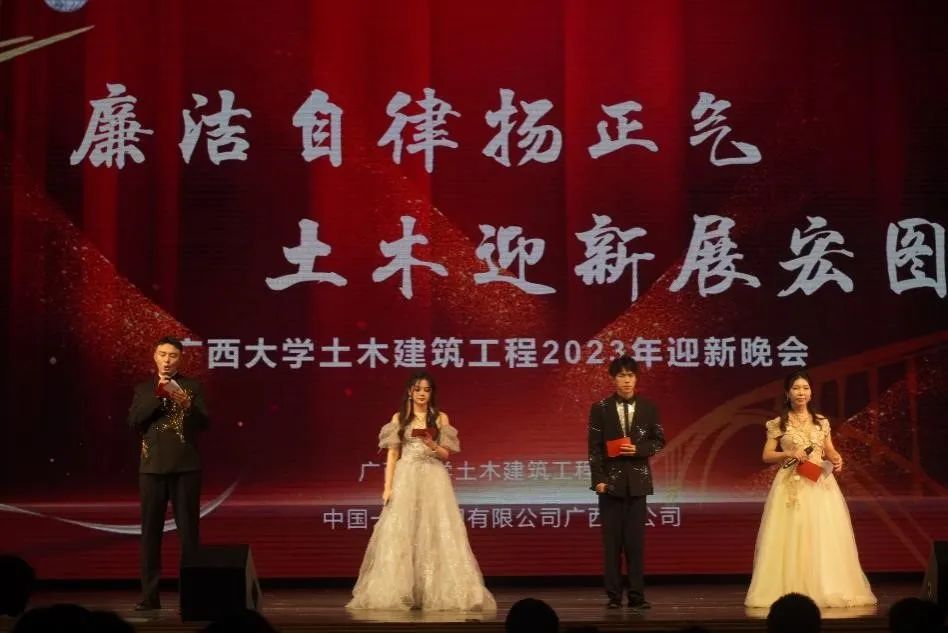 12月15日晚,伟德国际victor1946“廉洁自律扬正气,土木迎新展宏图”2023年迎新晚会在伟德国际victor1946大礼堂隆重举行。中国一冶集团有限公司广西公司副总经理、总工程师杨德志,人力资源部部长、党委组织部部长樊长春,伟德国际victor1946党委副书记银宁,副院长陈立华、宁裕忠、常岩军等学院师生欢聚一堂,共同感受这场视听盛宴。