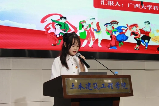 会议伊始,伟德国际victor1946君武青年讲师团嘉宾赵昕雨作了题为《让民族团结之花绽放在中华大地》的宣讲,她的宣讲围绕“走进历史——了解中华民族共同体”“走过十年——广西树立民族团结工作典范”“走近身边——青年助力民族复兴”三个篇章展开,她提出,作为土木学院的学生,不仅要关注专业知识和技能的学习,更要关注如何将个人的成长与国家的发展、民族的团结紧密结合起来。工匠精神代表着一种精益求精、追求卓越的精神状态,是青年学生应该大力发扬和传承的宝贵财富。