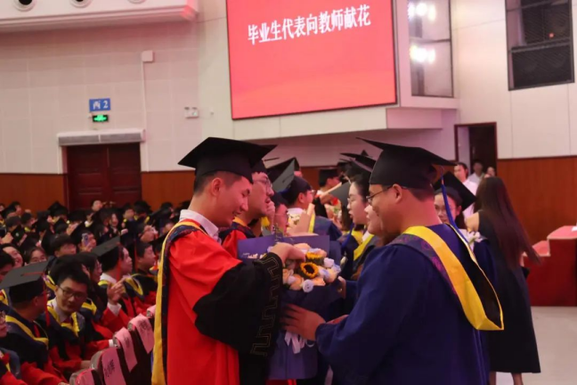 毕业生代表向辛勤耕耘的老师们献上鲜花,一束束鲜花承载着学子们对老师的感恩之情,现场弥漫着浓浓的师生情谊。