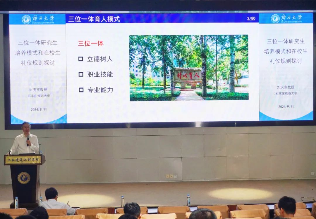 9月11日上午,石家庄铁道大学刘庆宽教授在我院大型结构试验研究平台第六报告厅作了题为“三位一体研究生培养模式和在校生礼仪规则探讨”的学术报告。本次报告由我院张稳军教授主持。