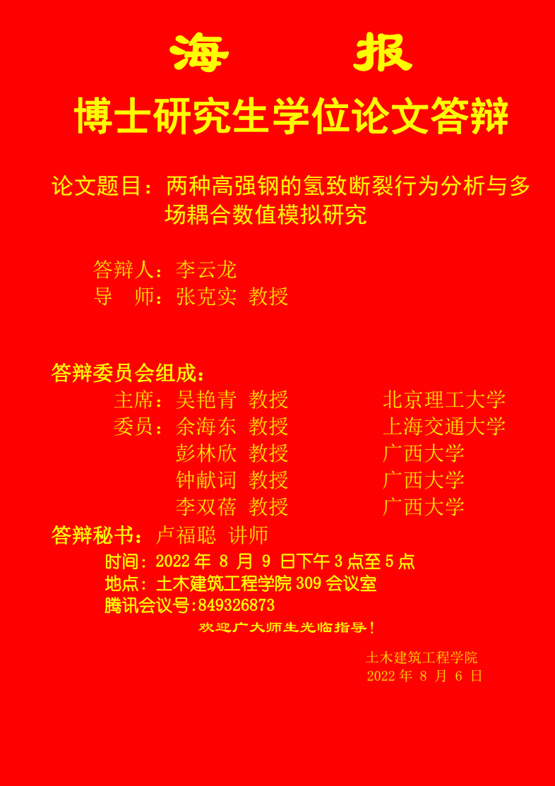 论文题目:两种高强钢的氢致断裂行为分析与多场耦合数值模拟研究