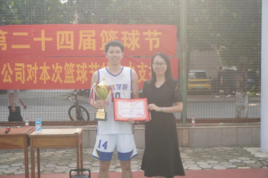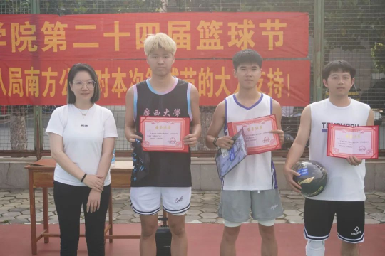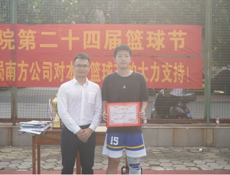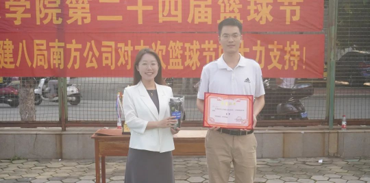 5月14日下午,比赛的颁奖仪式在我校西篮球场进行。学院党委副书记银宁,中建八局南方公司人力资源部副经理吴涛,中建八局广西分公司人力资源部经理赖小波,学院团委副书记潘桂祯,学工组老师陆源出席了本次颁奖仪式。本届篮球节,智能建造231与水利231联队李盟同学荣获本届比赛全明星人气王奖;专硕233潘忠立同学荣获本届比赛三分王奖;专硕221梁江同学获本届比赛全场最具价值球员奖,赖小波经理为三位获奖选手颁奖。