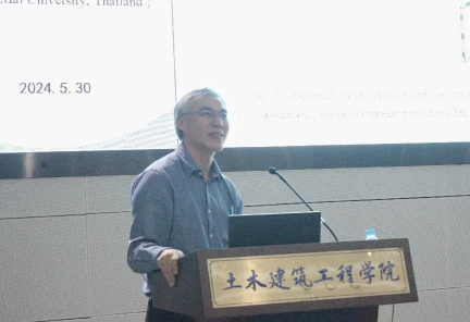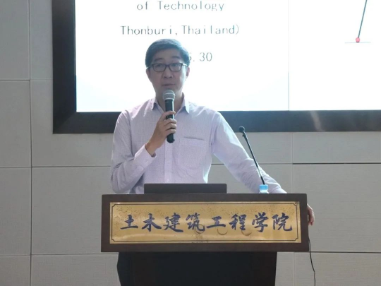 会议伊始,泰国宋卡王子大学Prof. Suchart Limkatanyu作了题为“Finite Frame Elements with Longitudinal and Lateral nterfaces: From Earthquake Engineering to Nanotechnology”的学术报告。他从有限框架单元公式、钢筋混凝土结构粘结-滑移效应、土-结构相互作用、纳米线弹性衬底系统、梁弹性基板系统几个方面介绍了他们团队主要研究内容,并对研究成果进行了总结。